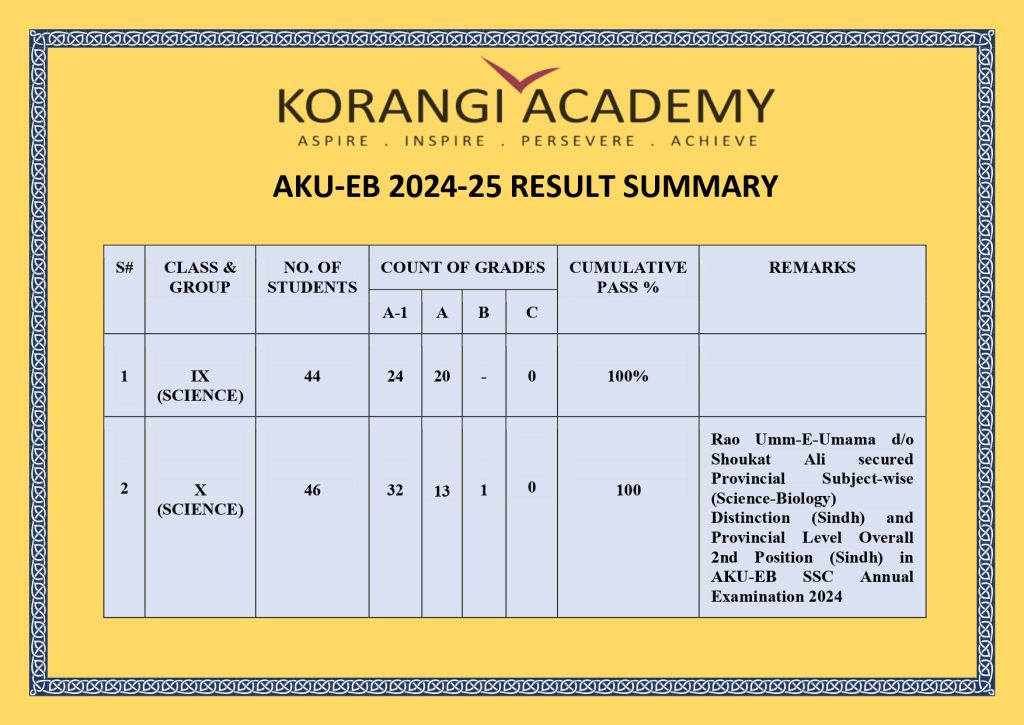 We, at Korangi Academy, are proud of our students who have produced outstanding results in the AKU-EB Board’s Examination. This demonstrates the quality of education at Korangi Academy, dedication of our teachers in the growth and development of our students, and the excellent talent that we have in our school.